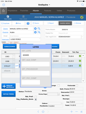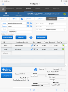 Generar albaranes desde su iPad es muy sencillo, lo más efectivo es realizarlos desde la ficha del paciente o la ficha de visitas, de ese modo se añadirán de forma automática todos los datos del paciente y propietario incluido el codigo Rega.