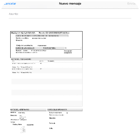 Ahora solo le queda modificar o añadir los datos que crea necesarío y pulsar en el botón "ENVIAR A PRESCRIVET" de forma automática su receta sera enviada a Prescrivet para su registro.