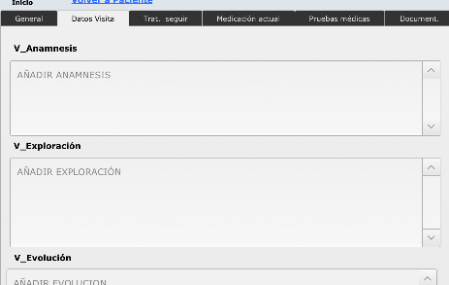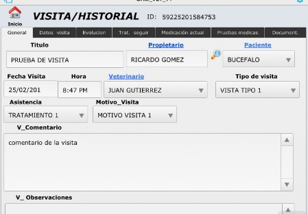 En una sola pantalla dispone de todos los datos relacionados con el propietario y paciente, fecha y hora de la visita, tipo de visita y motivo de la misma, comentarios generales de la visita, observaciones, etc.